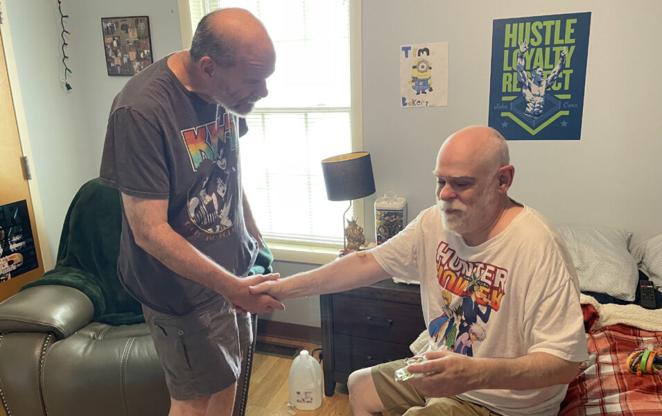There is a real tangible feeling of being loved in community. While not every core member is articulate in the traditional sense, they echo their love in a multiplicity of ways. The image above of our own Tim and Chris, two people who have limited speech, embody this. While they cannot say “I love you, and I am here for you” they still demonstrate the love of community, holding hands to pass the peace of Christ and love to one another in their joy and in their anguish. We are called to be like this.